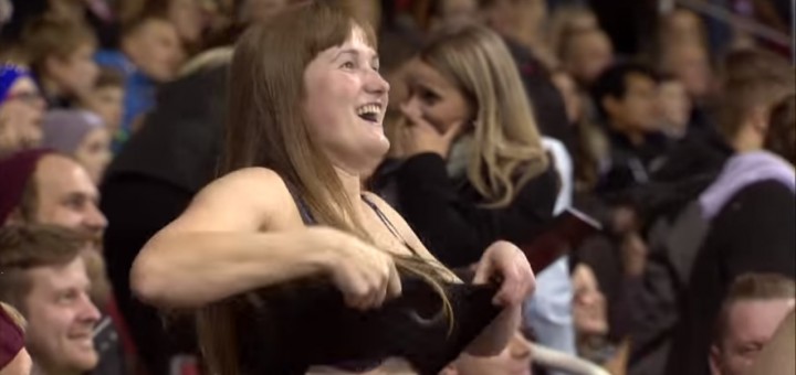Riga対Ufaの試合中、タイムアウトの際に会場モニターへ映し出された女性が、あるダンスを披露したのだ。